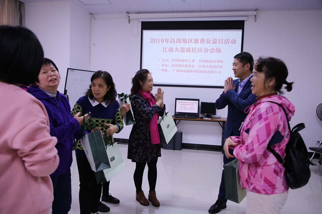 當(dāng)富諾健康領(lǐng)導(dǎo)將精心準(zhǔn)備的新年健康禮盒親手送到每位老人手中時,老人們臉上洋溢著幸福的笑容。海珠區(qū)江南大道南社區(qū)居委會主任麥巧云女士代表全體老人對富諾健康企業(yè)的關(guān)愛之情表示衷心的感謝。